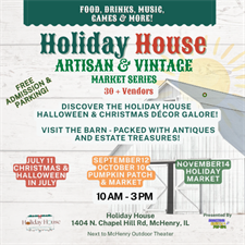Join us for a day of shopping and community fun at the Holiday House! Featuring 30+ artisan vendors, a Huge Barn Sale filled with vintage antiques & treasures, and shopping at the Holiday House - the go-to destination for all things Christmas & Halloween. Enjoy delicious food, drinks, music, and more! This is McHenry’s must-visit seasonal marketplace.