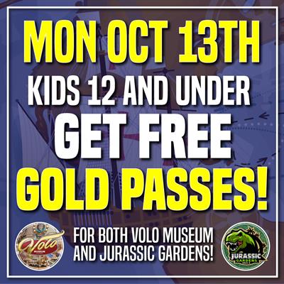 No school on Monday 10/13 means kids will be bored. So we are giving all kids 12 & under FREE Gold Passes which includes admission to both Volo Museum and Jurassic Gardens. All kids must be accompanied by an adult (18 year old) or parent/guardian.