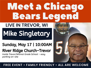 Join us at our Trevor Church, which meets in the Trevor Wilmot Grade School on May 17 at 10 a.m.for our worship service with special guest, Mike Singletary. Mike was an all-pro middle linebacker with the Chicago Bears for 12 years, a leader with the 1985 Super Bowl Championship team, and a Hall of Famer. He will share a message on faith and family. This is a free event, and all are welcome, whether you attend our church or not. This is a family-friendly event, and we will have a children's program during the service.